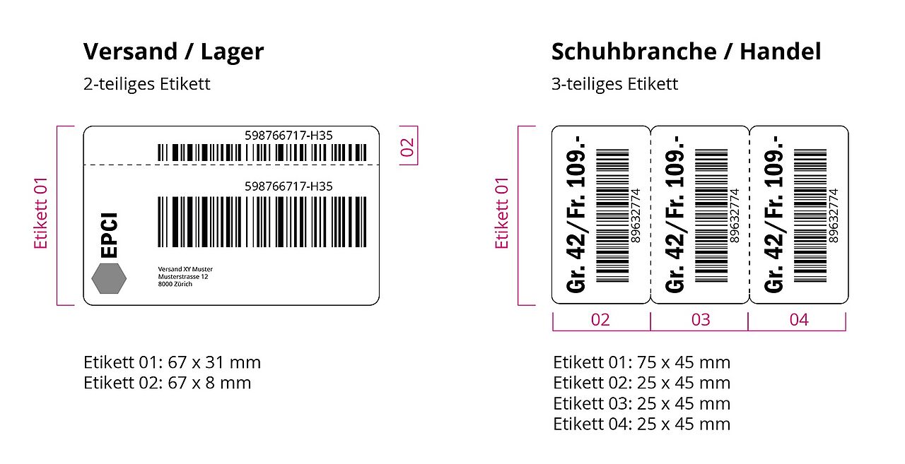 Unsere Duplex-Etiketten sind besonders in der Schuh-, Sport- und Modebranche beliebt, werden aber auch im Versand oder in der Produktion eingesetzt. Sie bestehen aus einem Basisetikett und mehreren Teiletiketten (Splits), die ablösbar sind und nach Belieben aufgeklebt werden können. Diese Etiketten können schwarz-weiss mit einem Thermotransfer-Drucker bedruckt werden.