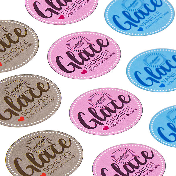 Runde Etiketten für Glace-Becher, Marmeladen-Gläser sowie andere Lebensmittelverpackungen und Kosmetikprodukte.