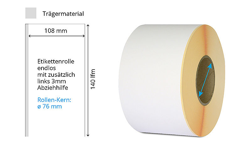 | 108 mm x 140 lfm | Weiss matt | Permanent | Endlos-Rolle | Inkjet SPP-R-554 | ø 76 mm | links 3mm Abziehhilfe | 044999 | ||