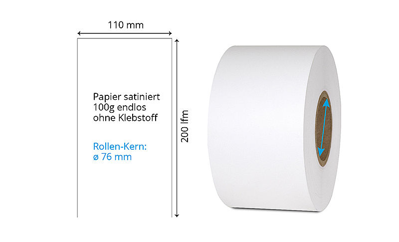 | 110 mm x 200 lfm | Hochweiss | Ohne | Endlos-Rolle | TT-Papier | ø 76 mm | Papier satiniert 100g | 040598 | ||