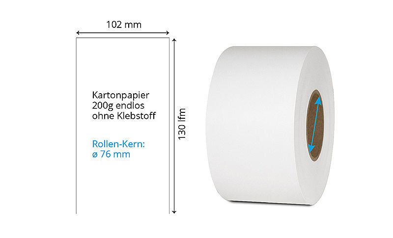 | 102 mm x 130 lfm | Weiss | Ohne | Endlos-Rolle | SMC-TT-R243 | ø 76 mm | Kartonpapier 200g | 040599 | ||