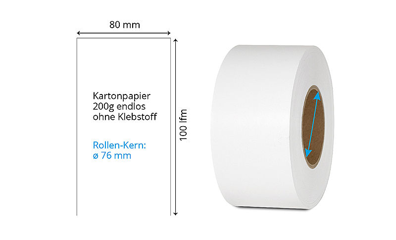 | 80 mm x 100 lfm | Weiss | Ohne | Endlos-Rolle | SMC-TT-R243 | ø 76 mm | Kartonpapier 200g | 040349 | ||