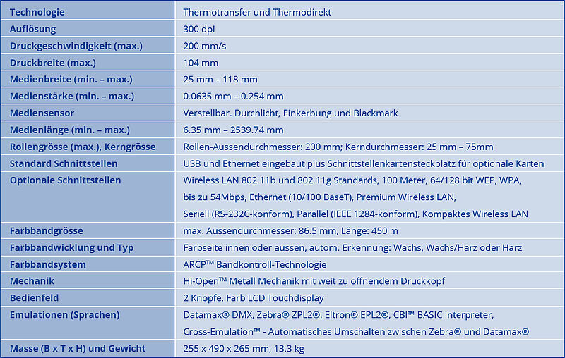 Der Thermotransfer und Thermodirekt Etikettendrucker mit Metallkonstruktion hat ein einzigartiges und platzsparendes Front-Ladesystem. Er ist also komplett von vorne bedienbar, einschliesslich Medien- und Farbband-Wechsel. Ideal bei beengten Platzverhältnissen. Zudem verfügt er über ein grosses grafisches LCD-Display, bei dem Sie jederzeit den Druckerstatus ablesen und den Drucker konfigurieren können. Durch die Datamax und Zebra Druckersteuerung sind Kompatibilitätsprobleme ausgeschlossen.