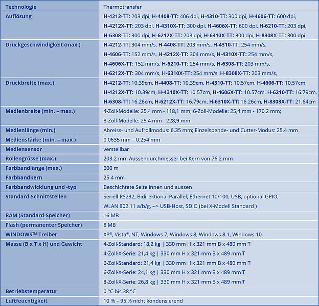 Die Datamax H-Class X-Modelle Drucker gibt es als 300 dpi, 400 dpi oder 600 dpi Versionen, sowie als 4 Zoll, 6 Zoll oder 8 Zoll breite Drucker. DieX-Modelle haben im Gegensatz zu den normalen H-Class Druckern ein erhöhtes Gehäuse, für die im Gehäuse interne Etiketten-Aufwickelvorrichtung für ganze 8 Zoll Etikettenrollen mit Trägerpapier. Zudem sind bei den Datamax H-Class X-Modellen zwei USB Steckerplätze (für Scanner, Memory-Stick, etc.) sowie ein SDIO-Slot für eine SD-Speicherkarte standardmässig ab Werk eingebaut.