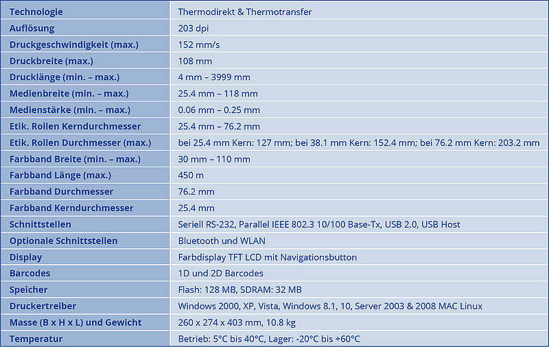 Die ganze Druckerkonstruktion ist solide und robust gebaut. Die „Drop-In“ Etiketten-Rollen Halterung unterstützt das einfache Wechseln der Etikettenrollen. Die vorhandene USB-Host Smartprint Funktion zusammen mit dem Farbdisplay prädestinieren den Drucker auch für intelligente Druckerlösungen ohne Computer-Anschluss. Optional ist für dieses Modell auch ein Etikettenspender, eine Schneide-Vorrichtung, ein externer Etikettenaufwickler sowie eine Bluetooth & WLAN Schnittstelle erhältlich.