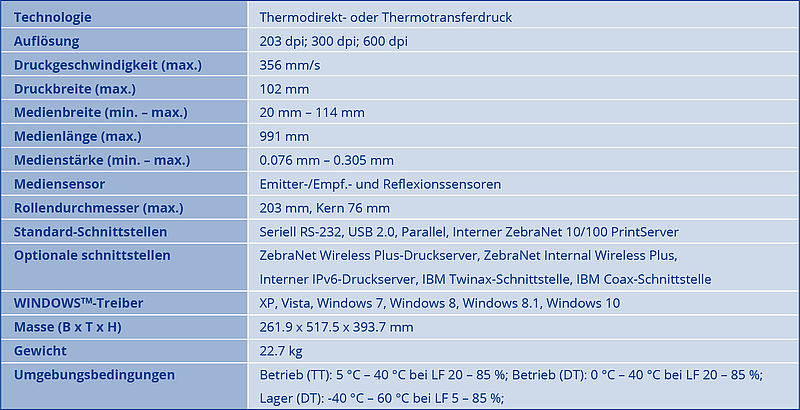 Der Drucker ist in den Versionen von 200 dpi, 300 dpi und 600 dpi Druckauflösung verfügbar und hat eine maximale Druckbreite von 102 mm.