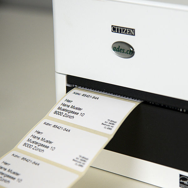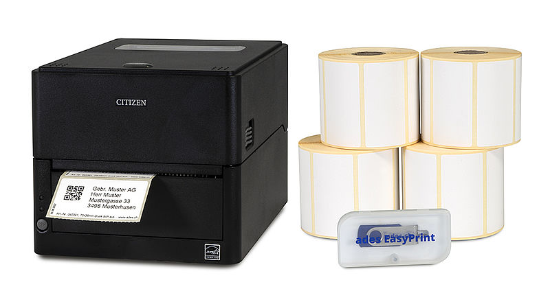 Im anschlussfertigen Set, Art.-Nr. 171938ADRESS1 ist alles enthalten, was Sie für den Druck Ihrer Adress- und Versandetiketten benötigen. Nebst Drucker und ADES ReferenzPlus Support erhalten Sie 3‘600 Adressetiketten im Format 70 x 36 mm, eine Etikettensoftware BarTender UltraLight, Windows Treiber und alles andere für die problemlose Inbetriebnahme.