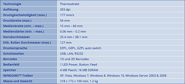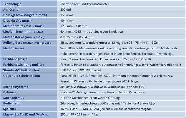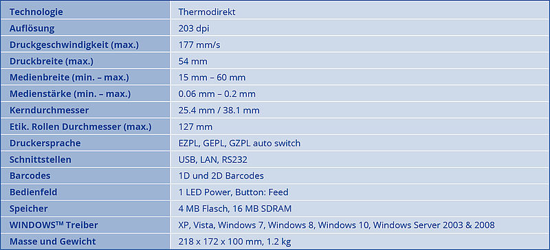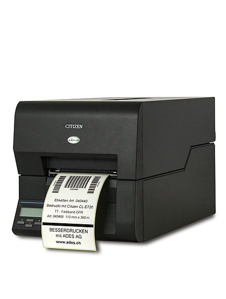 Dank der sehr kompakten Bauweise benötigt der Drucker nur wenig Platz auf der Stellfläche und kann bei Bedarf sogar direkt an die Wand montiert werden. Die Anschlüsse wie USB, LAN und RS232c sind standardmässig integriert. Etikettenspender, Schneidevorrichtung sowie Aufwickler und Rollenhalter für grosse Etikettenrollen sind als Zubehör erhältlich.