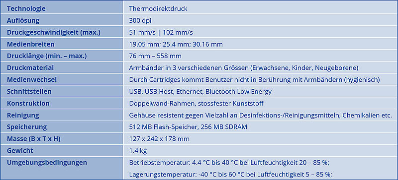 Anwendungen im Gesundheitsbereich: Die Armbänder sind resistent gegenüber Wasser, Seife, Alkohol und anderen Lösungsmitteln, sodass der Aufdruck langfristig bestehen bleibt. Ausserdem verfügt der Drucker über ein medizinisches Gehäuse, welches ebenfalls mit Desinfektionsmittel gereinigt werden kann.