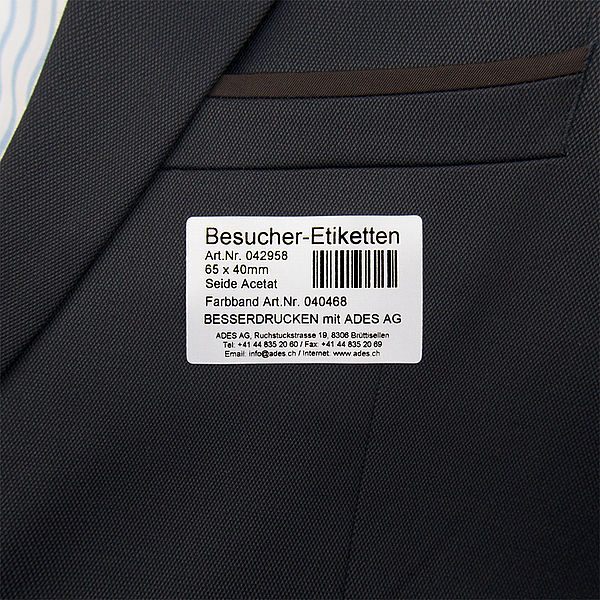 Selbstklebe-Etiketten aus Acetat-Seide, welche den Besuchern direkt auf den Anzug geklebt werden, sind beliebte Identifikationssysteme für Firmenanlässe.