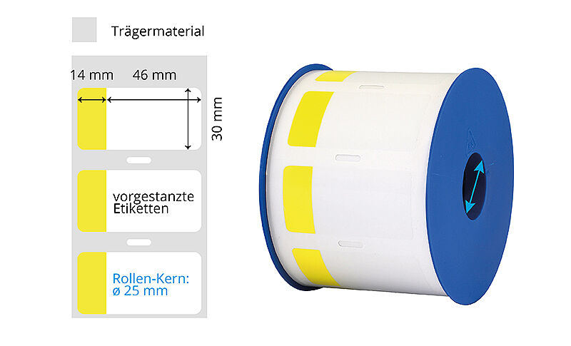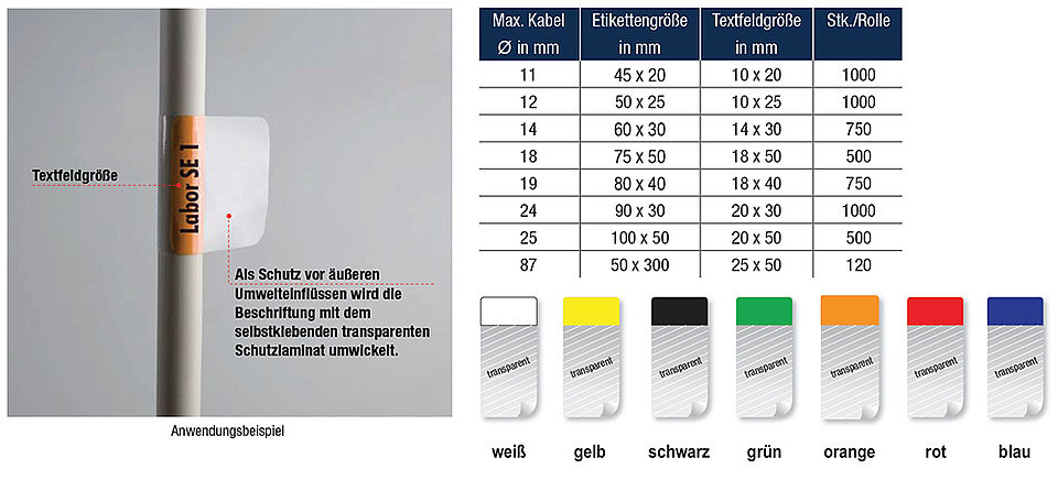 Sie können zwischen verschiedenen Farben und Grössen wählen. Beachten Sie dabei, dass die Etikettengrösse auf die Kabeldicke abgestimmt sein sollte. Standardgrössen ab Lager: