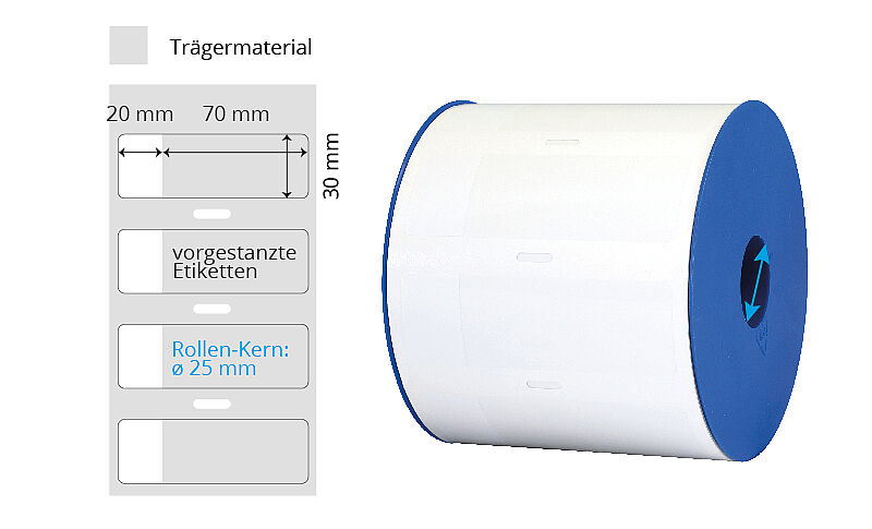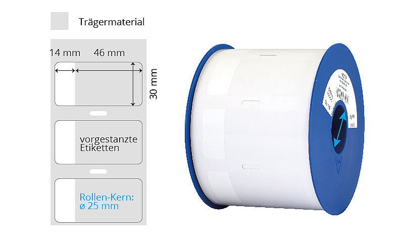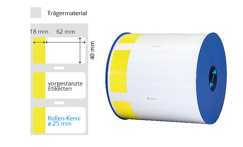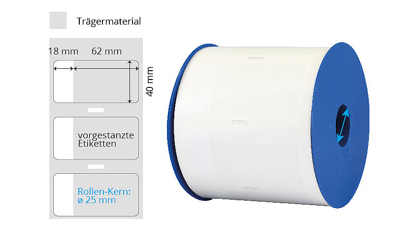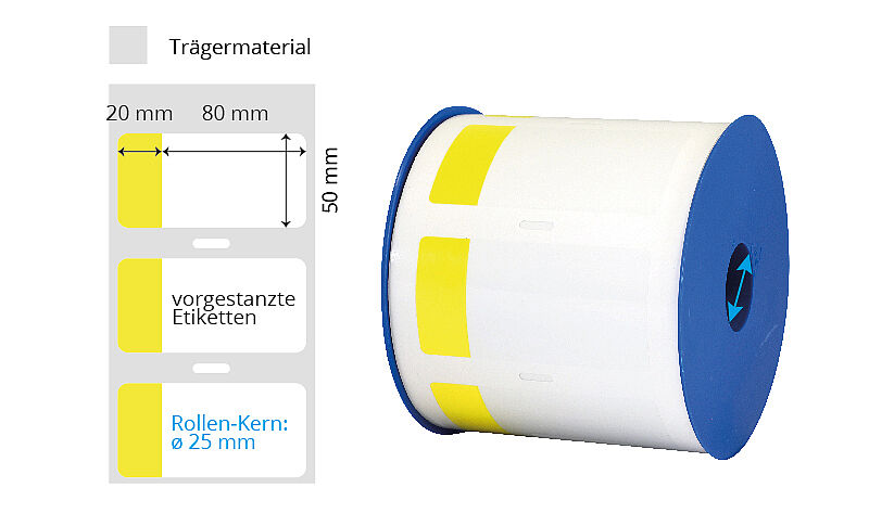 | Grösse (BxH) | Farbe | Klebstoff | Etik./Rolle | Material | Kern | Bemerkungen | Art.-Nr. | ||
