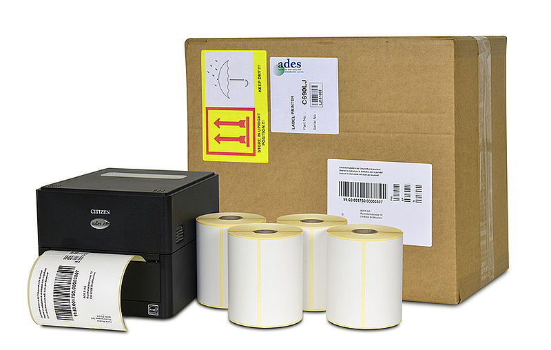 Im anschlussfertigen Set ist alles enthalten, was Sie für die Produktion Ihrer Versandetiketten benötigen. Nebst Drucker und ADES ReferenzPlus Support erhalten Sie vier Etikettenrollen (Art.-Nr. 040409, 101 x 152 mm), eine Etikettensoftware und alles andere für die problemlose Inbetriebnahme.