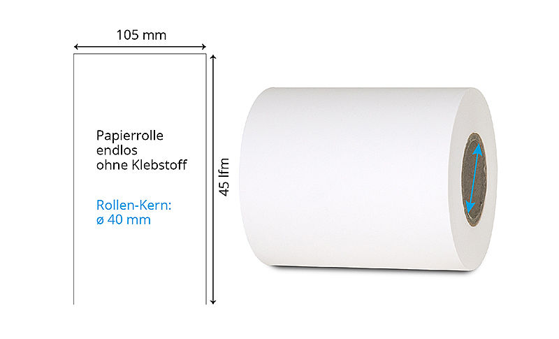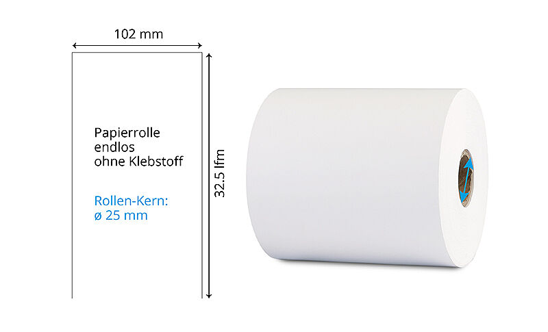 | 102 mm x 100 lfm | Weiss | Ohne | Endlos-Rolle | DT-Papier | ø 25 mm | 55 g Papier | 040606 | ||