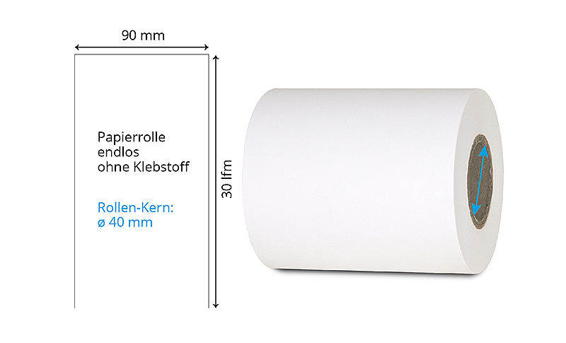 | 80 mm x 70 lfm | Weiss | Ohne | Endlos-Rolle | DT-Papier | ø 40 mm | 150 g Papier | 040614 | ||