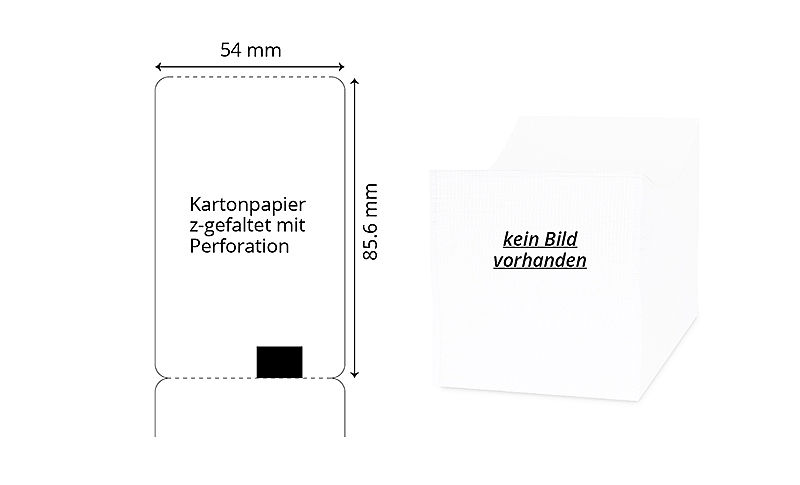 | 54 x 85.6 mm | Weiss | Ohne | 1'000 / Box | Kartonpapier | – | z-gefaltet mit Perforation, Blackmark auf RS | 041350 | ||