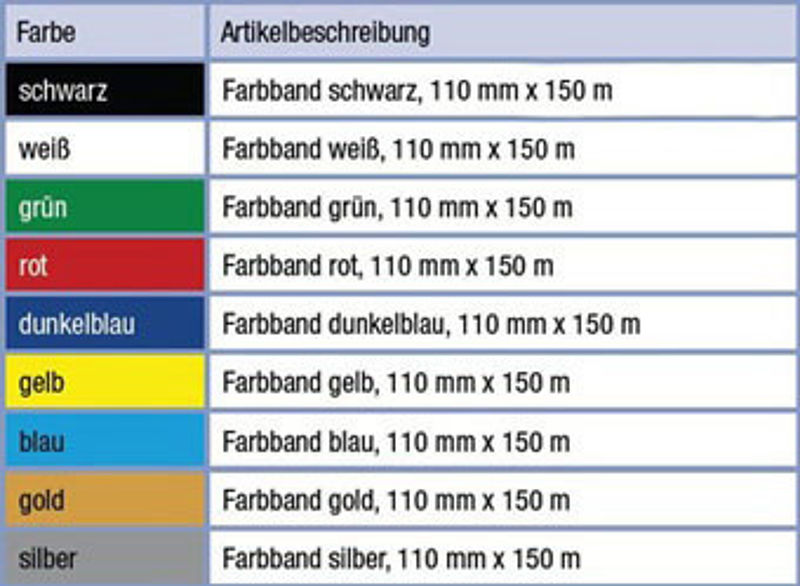 Andere Farben (gelb, grün, rot, silber, gold) für Vinyl-Bänder und Vinyl-Etiketten auf Anfrage.