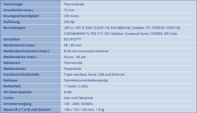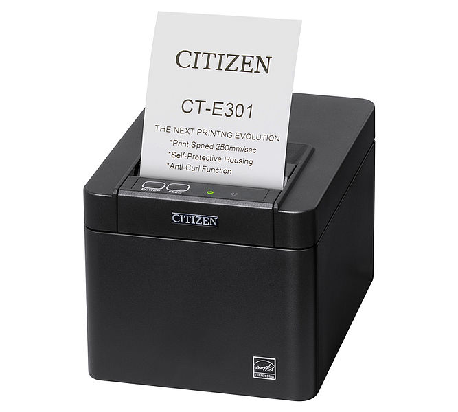 Der CT-E301 bietet mehrere Anschlussmöglichkeiten (USB oder dreifachem USB-, seriellem und Ethernet-Anschluss) sowie einen Anschluss für eine Kassenschublade. Darüber hinaus können Sie beim Citizen CT-E301 die Papierbreite selbst einstellen 57,5 - 79,5 (+/- 0,5 mm). Der schnelle Belegdruck von 250 mm pro Sekunde, der schnelle und leise Papierabschnitt (Voll-/Teilschnitt) sowie die Kassenfachausgabe machen ihn zum Topmodell.