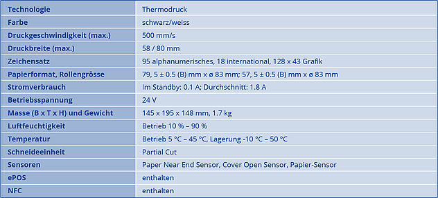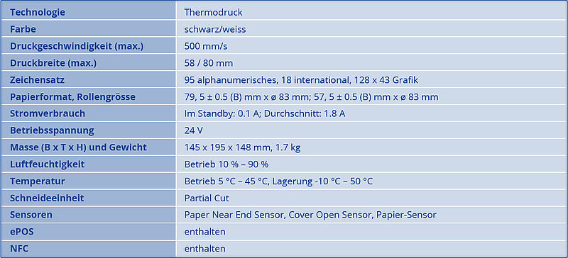 Der Epson TM-T88VII ist ein klassischer POS-Drucker und kann Kassenbons mit einer Breite von 57mm und 80mm mit Text, Grafik und Strichcode bedrucken.