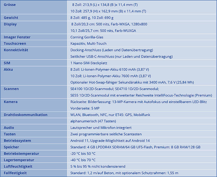 Jetzt gibt es die neuen Enterprise-Tablets ET40 und ET45, die speziell für den Einsatz in Unternehmen konzipiert sind. Sie bieten von Anfang an alles, was Sie benötigen. Ein flaches, leichtes Design im Endverbraucher-Stil, integrierte Scanfunktion, schnelle Drahtlosverbindung, mehrjährigen Lebenszyklus usw. Die ET40/ET45 Enterprise-Tablets bieten alles, was Sie brauchen, um besser zu arbeiten, zum richtigen Preis.