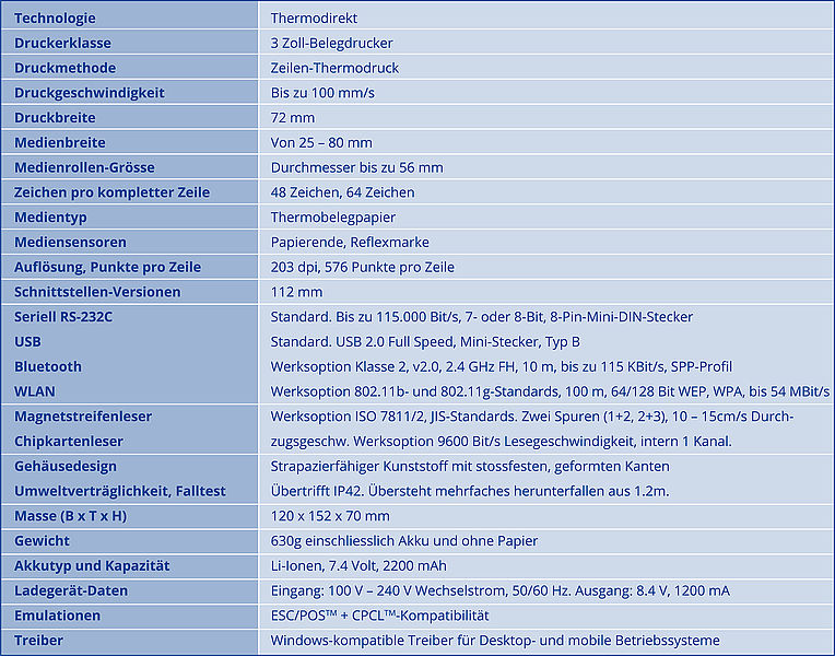 Mit dem mobilen Drucker drucken Sie Medien mit einer Breite von 25 bis 80 mm mit einer Druckgeschwindigkeit von 100 mm pro Sekunde.