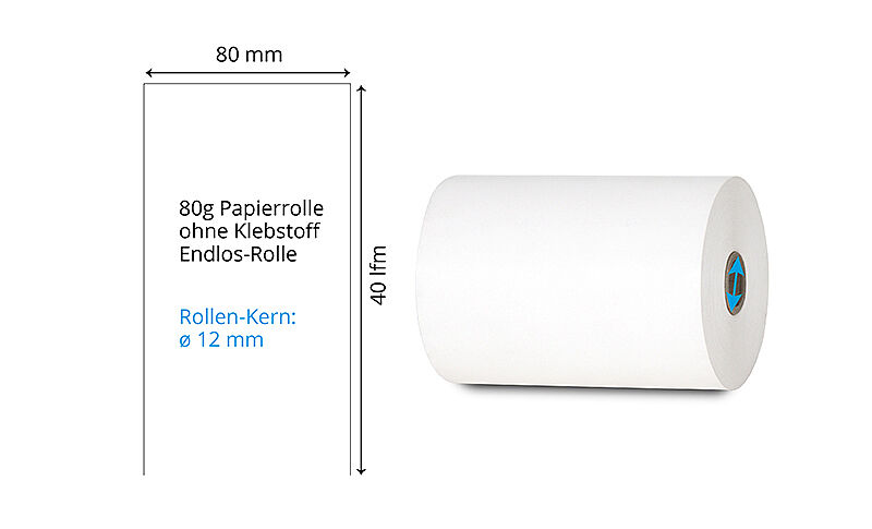 | 80 mm x 40 lfm | Weiss | Ohne | Endlos-Rolle | DT-Papier | ø 12 mm | 80 g Papier | 040393 |