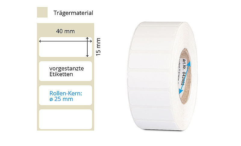 | Grösse (BxH) | Farbe | Klebstoff | Etik./Rolle | Material | Kern | Art.-Nr. | ||