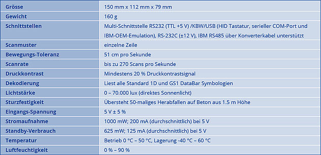 Bei 270 Scans pro Sekunde liest der ScanBar 1300g alle 1D- aber auch GS1 und DataBar-Codes. Durch die integrierte Imager-Technologie wird auf bewegliche Komponenten verzichtet. Diese sind auf ein Minimum reduziert, damit eine besonders robuste Bauweise gewährleistet werden kann. Selbst mehrfache Stürze auf Beton übersteht der Scanner dank IP41-Klassifizierung problemlos.