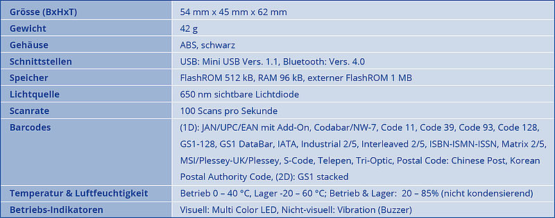 Die Möglichkeit dank Bluetooth 4.0 kabellos zu scannen und die Funk-Übertragungsweise bis zu 25m bieten dem Nutzer einen unvergleichlichen Komfort und Bewegungsfreiheit beim Arbeiten und Scannen der Produkte. Der extrem kompakte Scanner kann auf einem oder zwei Fingern mittels einstellbarem Band getragen werden. Das Auslösen des Lasers zum Scannen erfolgt mit dem danebenliegenden Finger oder Daumen.